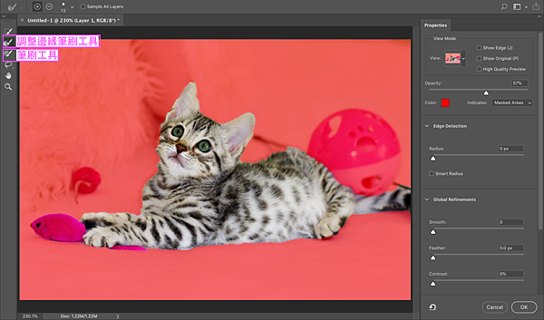 6. 使用左側工具列的「調整邊緣筆刷工具」、「筆刷工具」做更細節的修改