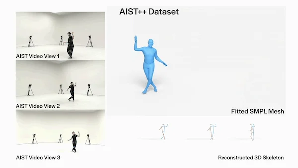 Google 依研究人員的需求,根據常用的 SMPL 3D 模型參數,修復 AIST 影片的拍攝校準正後的數值,以及 3D 人體動作,重建為「AIST++」數位資料庫。重建後的「AIST++」包含與音樂搭配的各種 3D 動作,並將上述十種舞蹈均勻地呈現在動作中、以每分鐘節拍 (BPM) 為單位涵蓋各種音樂節奏。每種舞蹈類型都含 85% 的基本動作和 15% 的進階動作(舞者自由設計的更長編舞)。